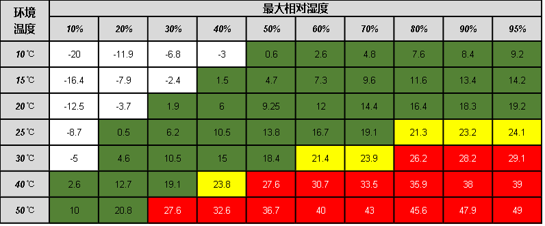 具體的露點(diǎn)與環(huán)境溫濕度直接的對照關(guān)系,可參見下表——